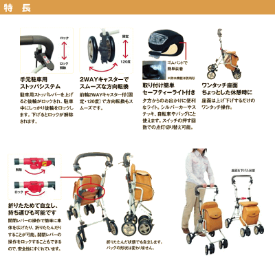 ○座面耐荷重:80kg サイズ ○使用時:約H84〜93×W40.5×D58.5cm ○ハンドル高:約H84〜93cm(4段階ピッチサイズ約3cm) ○収納時:約H79×W40.5×D34cm ○座面:約W24×D19cm ○座面高:約47cm ○前輪13cm 後輪14.5cm 素材/材質 ○本体/アルミ(粉体塗装) タイヤ/EVA ホイル/PP ○バッグ ・表生地 ローズ柄R/ポリエステル メッシュキャメル/ビニールレザー ・保冷剤/発砲ポリエチレン ・裏生地/ナイロン ○セーフティライト ゴム部分/TPE ライト部分/LED、プラスチック 重量 ローズ柄R/約3.7kg メッシュキャメル/約3.9kg 耐荷重 80kg バッグ容量 ○サイズ 約H25×W21×D17cm(外寸) ○容量6L 車輪 2WAY(左右各60°+ 固定) 注意事項 ※画面上と実物では多少色具合が異なって見える場合もございます。